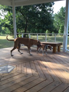 Another little dog joined us and I have been delighted to watch as he and Cooper play and growl at each other.  Cooper is very protective and makes every effort to stay between me and Buster.  Poor little Buster has had Cooper’s slobber all over his back for most of the day as Cooper pants and drools and chases him away from me.  Cooper even tried to sit on him at one point.  I have to admit, I love my little Marmaduke!