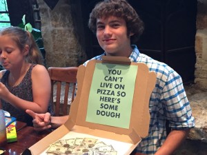 Aunt Lou and Uncle Michael gave Bryce a pizza box with lots of “dough”. And my sister, Abby demonstrated gang signs with him – in case he might need this in a dark alley someday. It was a fabulous party.